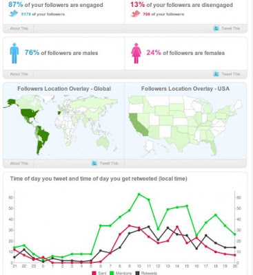 In questo sito si può vedere il numero di lettori che sono online in qualsiasi momento, la distribuzione geografica, età, sesso, utenti attivi, i lettori per mesi che non si connettono (che non vuol dire che non leggerlo), utenti fantasmi (creati gli account inattivi per inviare spam) ... in breve, una miriade di dati da analizzare, al fine di trasformare qualsiasi account personale di Twitter in uno strumento di comunicazione professionale.